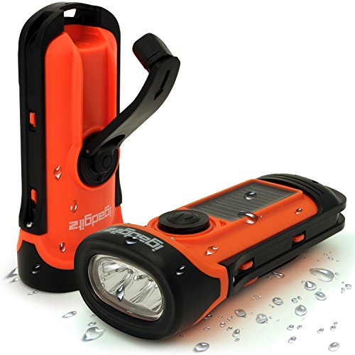 Solar and hand crank dynamo rechargeable. 3 shiny LEDs with as much as 8lm output